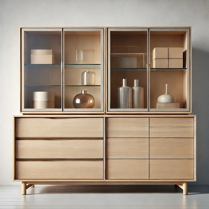 Nowoczesna komoda z połączeniem zamkniętych szuflad i przeszklonych sekcji. Dwie drewniane szuflady oraz górna część z przeszkleniem doskonale nadają się do ekspozycji dekoracji. Wykończenie w jasnym dębie dodaje elegancji.